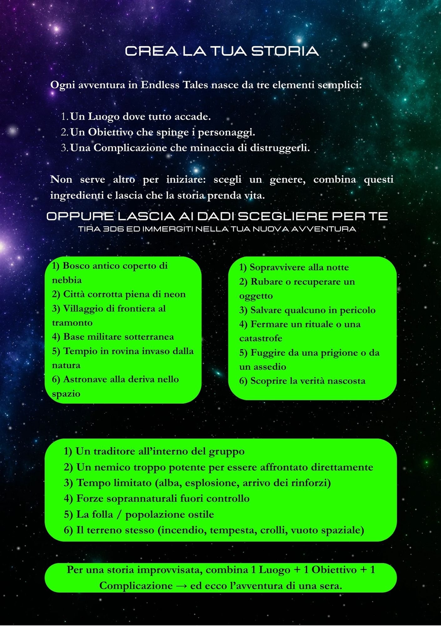 Endless Tales è un sistema di gioco di ruolo universale per qualsiasi storia tu voglia raccontare. Dalle ribellioni Cyberpunk al dark fantasy, dall’Horror infestato ai western più crudi e molto altro.